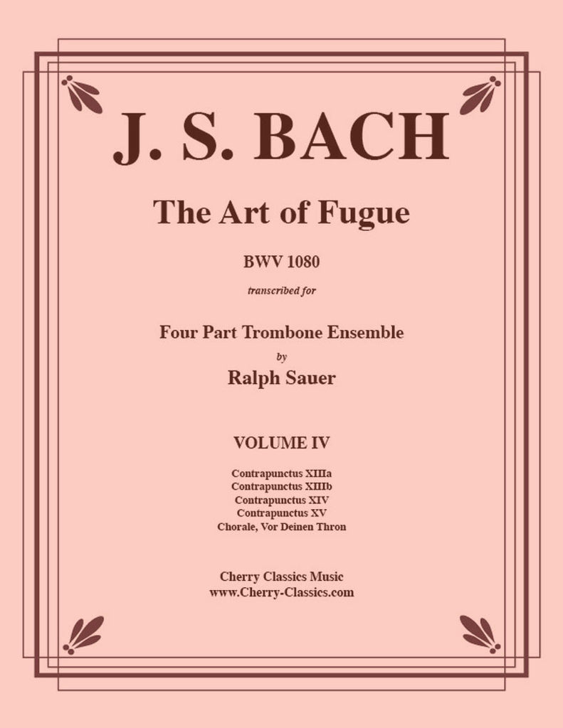 Bach's great monument, The Art of Fugue has been newly transcribed by Ralph Sauer for Four Part Trombone Ensemble. Volume 4 contains four Contrapuncti 13a, 13b, 14, 15 and his last work, the Chorale, Vor Deinen Thron.